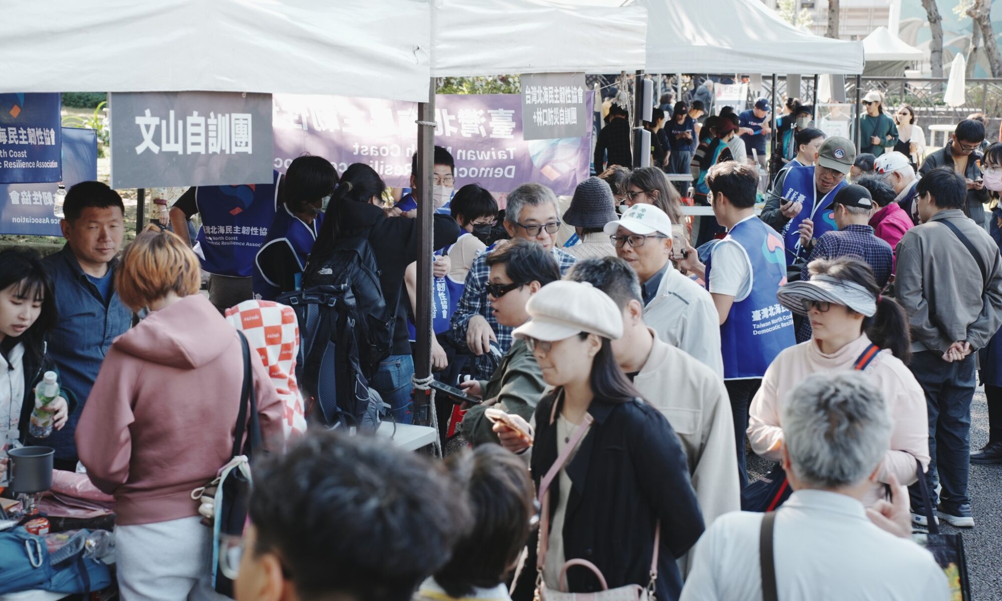 在今天反侵略日歌唱節中,過去一向低調運作的各地民防自訓團,在此集結公開現身:壯闊台灣的《後盾計畫》緊急應變訓練;濟南自訓團現場教學救護三角巾包紮;文山自訓團則演示災時自救的避難包配置與止血帶使用;台灣北海民主韌性協會、林口防災自訓團分享深耕在地韌性網的建構經驗;板樹沙崙自訓團、民主星際站教導民眾手機個資保護;板橋海山自訓團將民防延伸至「寵物避難包」與寵物 CPR;大嵙崁溪流域居民則提供農夫走路等體能肌力體驗。