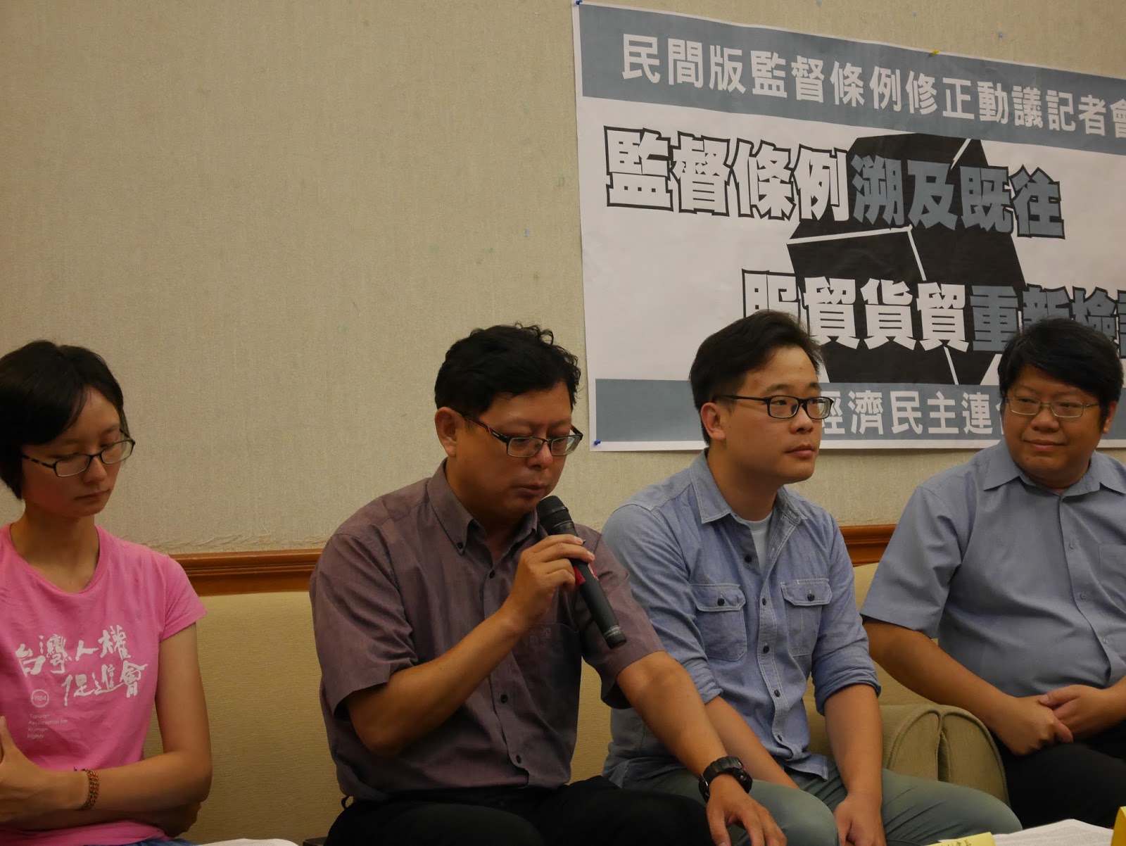 經濟民主連合、國會調查兵團、台灣勞工陣線、臺左維新、民主鬥陣、台灣人權促進會等團體今日(6/23)於立法院召開記者會,公布「監督條例過渡條款修正動議」,主張民進黨版監督條例草案針對立法前已進行談判但尚未經國會審查之台、中雙邊協議,應增列回溯監督條款,才得以重新檢討服貿及貨貿協議。民進黨立委林淑芬、蔡培慧亦出席記者會表達關心。記者會後與會團體並共同拜會時代力量黨團,尋求支持。