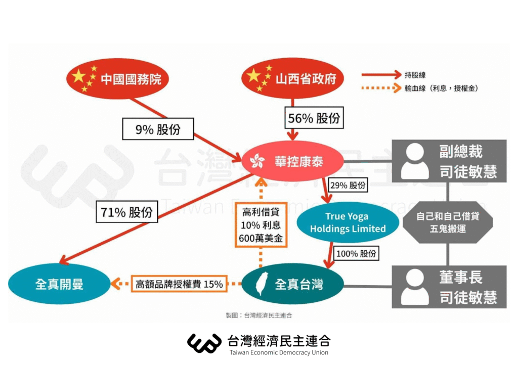 經濟民主連合智庫研究員黃承瀚指出,「全真台灣」的崩潰,並非單純的經營不善,而是一場精心策劃的資本掠奪,其操作手法清晰地揭示了中國國有資本如何利用法律與金融工具,滲透、控制並最終摧毀一家辛勤經營的台灣企業。黃承瀚首先梳理「全真台灣」背後複雜的股權控制鏈。表面上,根據經濟部公司登記資料,「全真台灣」全部股份皆為「True Yoga Holdings Limited」所投資持有;而香港上市公司「華控康泰」(Kontafarma, 港交所代號:1312)則公開揭露該公司持有True Yoga Holdings Limited共29%股份。